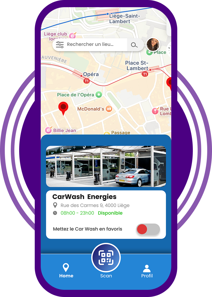 Dans l’application CarWashFlow, la carte interactive vous montre :